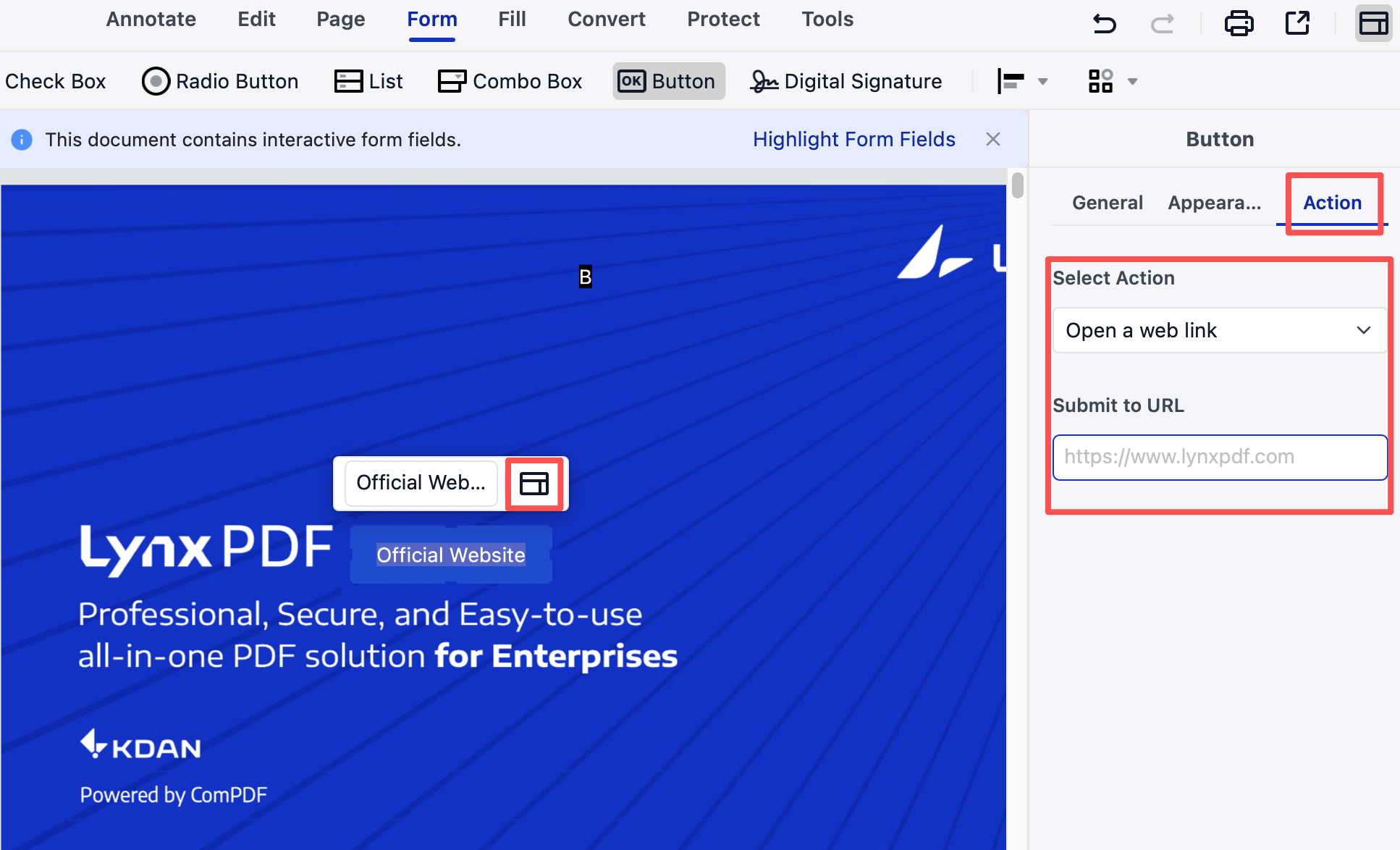 Effective enterprise forms start with the right field types. LynxPDF supports text fields, checkboxes, radio buttons, dropdowns, buttons, and digital signature fields, allowing teams to define precise input rules and maintain consistent structures across all documents.