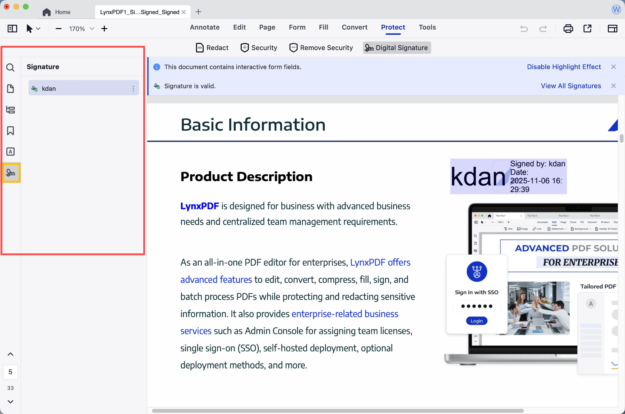 Using LynxPDF, finance teams can securely sign PDFs of invoices, verify digital certificates, and confirm whether documents have been modified after signing. Managers can instantly check the signature status in the sidebar — reducing approval time while maintaining full auditability.