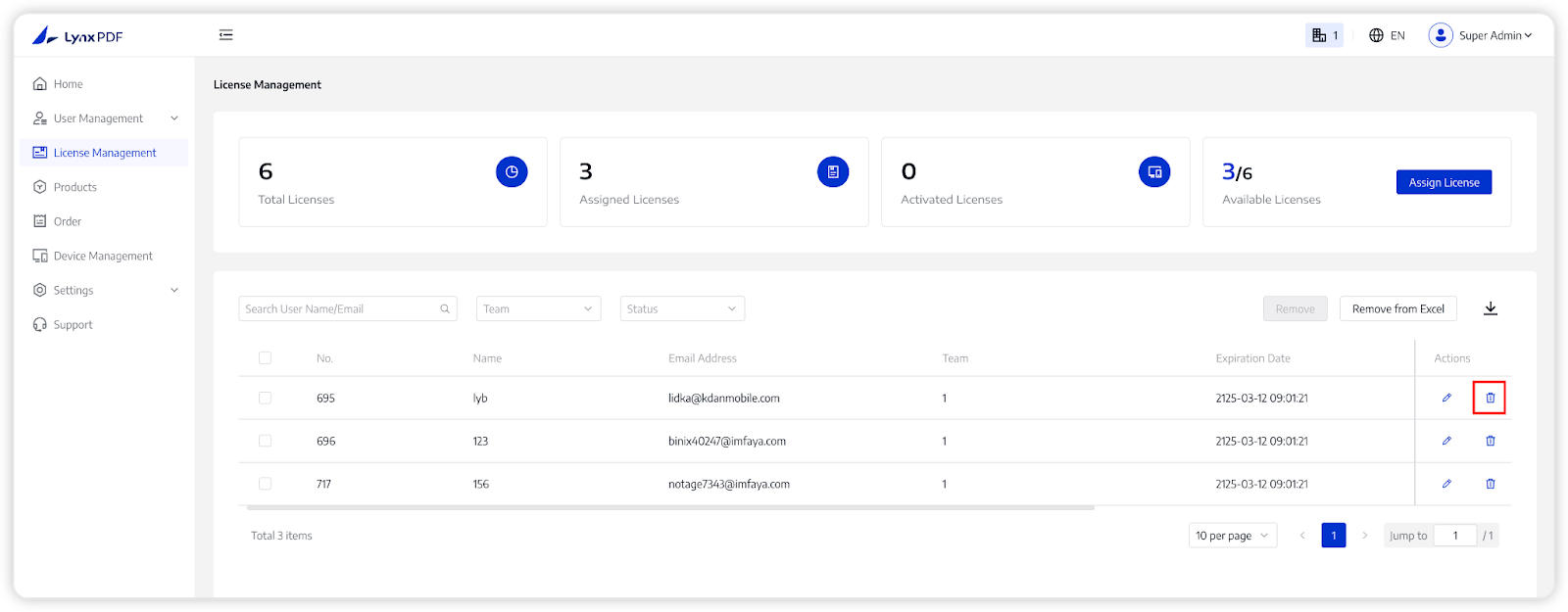 If the Super Admin and Team Admins need to remove many members’ licenses, this function can help them save a lot of time. You can remove in bulk by selection or import a removal list from a file.