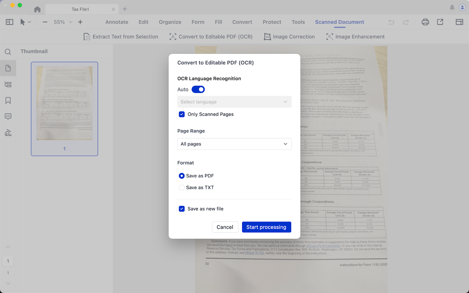 3. Set your desired Language, Page Range and Format, click Start processing;
