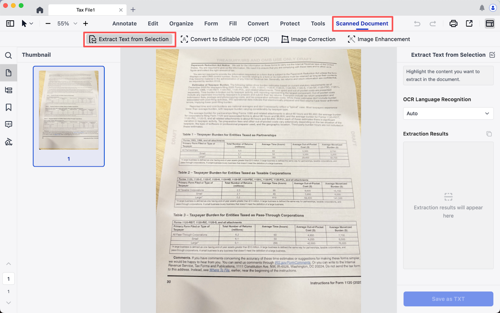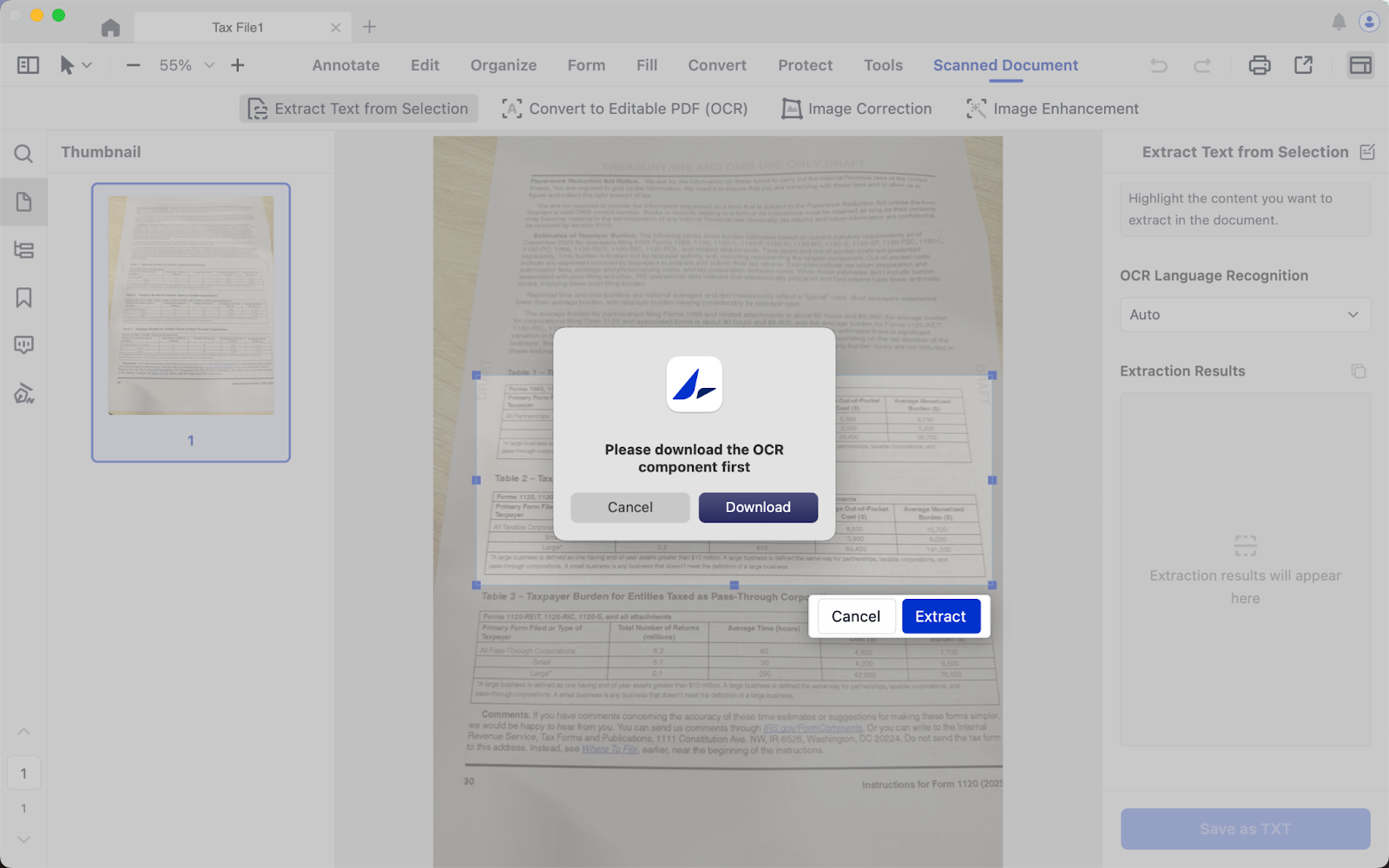 2. Go to Scanned Document in the Toolbar, then click Extract Text from Selection;