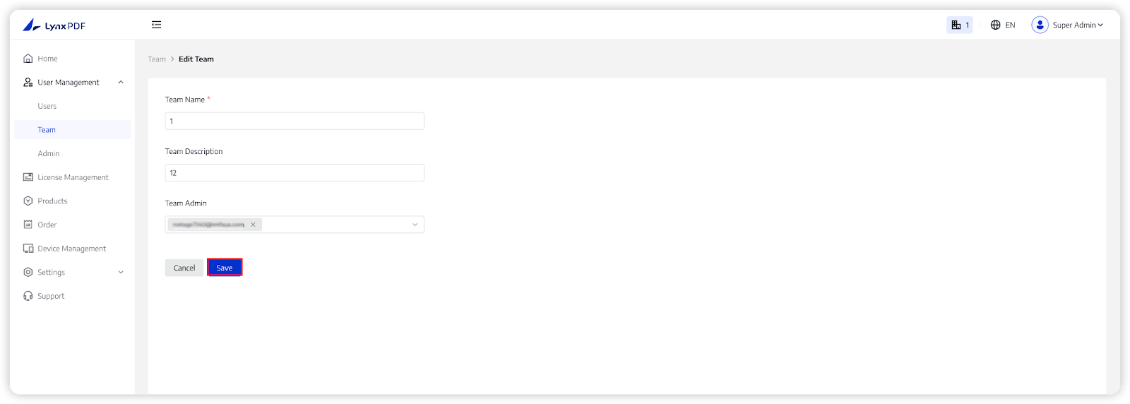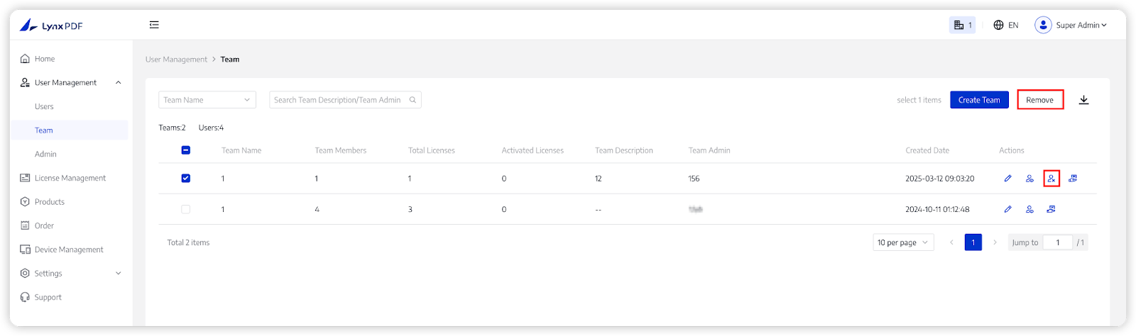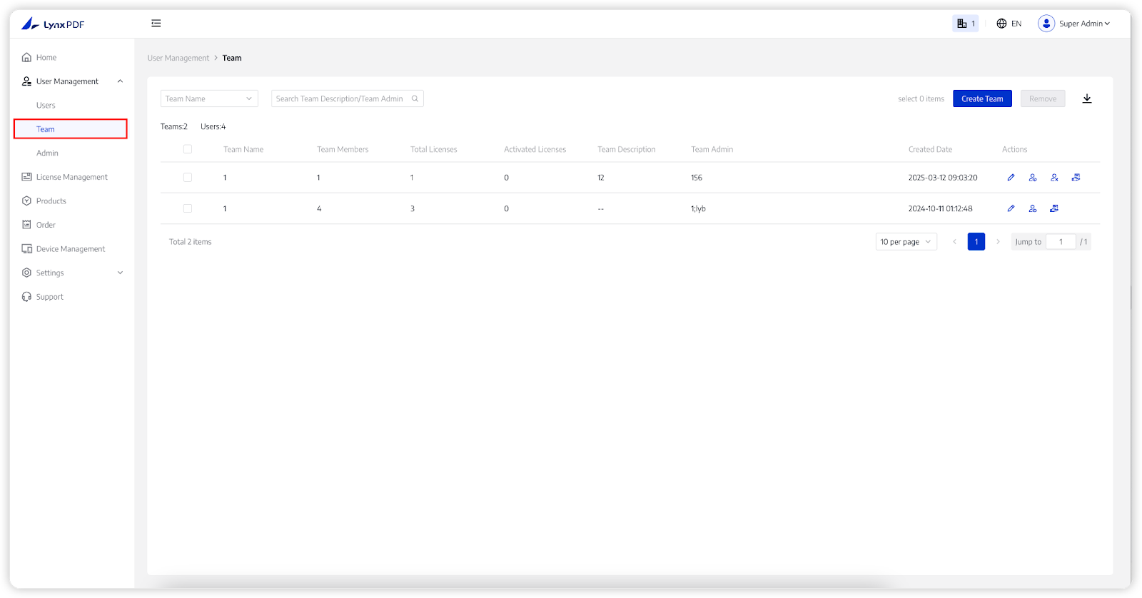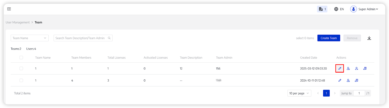 - Only Super Admin can change Amount of Team License and Team Admin;